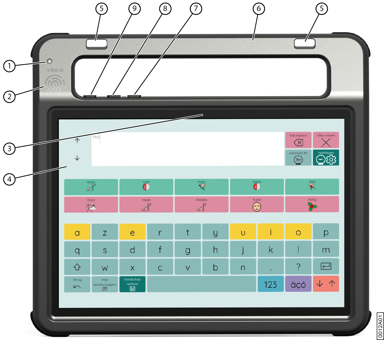 | 13 | Tray stand | The Vibe 10 has a folding stand. The stand is designed so that the device can be ergonomically supported on a tray. |