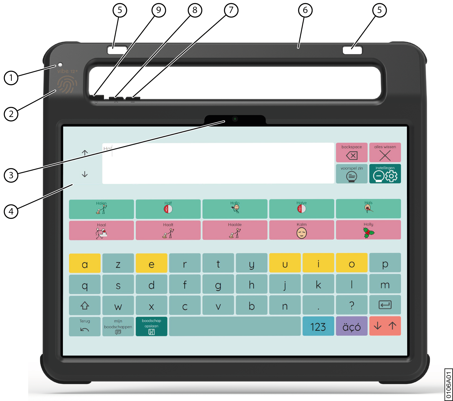 The device has a fold-out stand. The stand is designed so that the device can be ergonomically supported on a tray. |